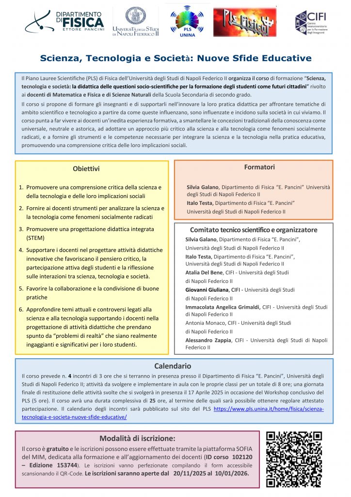 Il corso è gratuito e le iscrizioni possono essere effettuate tramite la piattaforma SOFIA del MIM, dedicata alla formazione e all’aggiornamento dei docenti (ID corso 102120 – Edizione 153744). Le iscrizioni vanno perfezionate compilando il form accessibile scansionando il QR-Code presente sulla locandina oppure cliccando sul LINK seguente:Iscrizione corso formazione docenti “Scienza, Tecnologia e Società: Nuove Sfide Educative” – Compila modulo